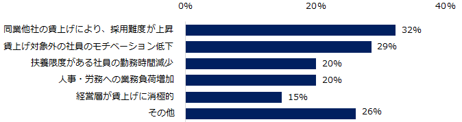 最後に、賃上げに関する悩みや課題を伺いました。上位は「同業他社の賃上げにより、採用難度が上昇」(32%)、「賃上げ対象外の社員のモチベーション低下」(29%)でした。