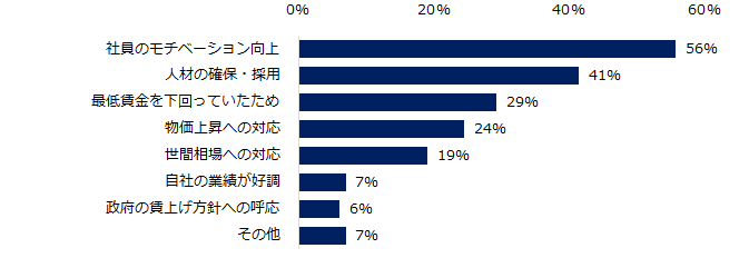 続けて「アルバイト・パートの賃上げを行なった」と回答した企業に、賃上げを実施した理由を伺うと、上位は「社員のモチベーション向上」(56%)、「人材の確保・採用」(41%)、「最低賃金を下回っていたため」(29%)でした。正社員、アルバイト・パートいずれも、第1位「社員のモチベーション向上」、第2位「人材の確保・採用」は共通していることが分かりました。