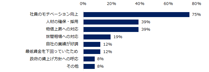 「正社員の賃上げを行なった」と回答した企業に、賃上げを実施した理由を伺うと、上位は「社員のモチベーション向上」(75%)、「人材の確保・採用」「物価上昇への対応」(同率39%)でした。