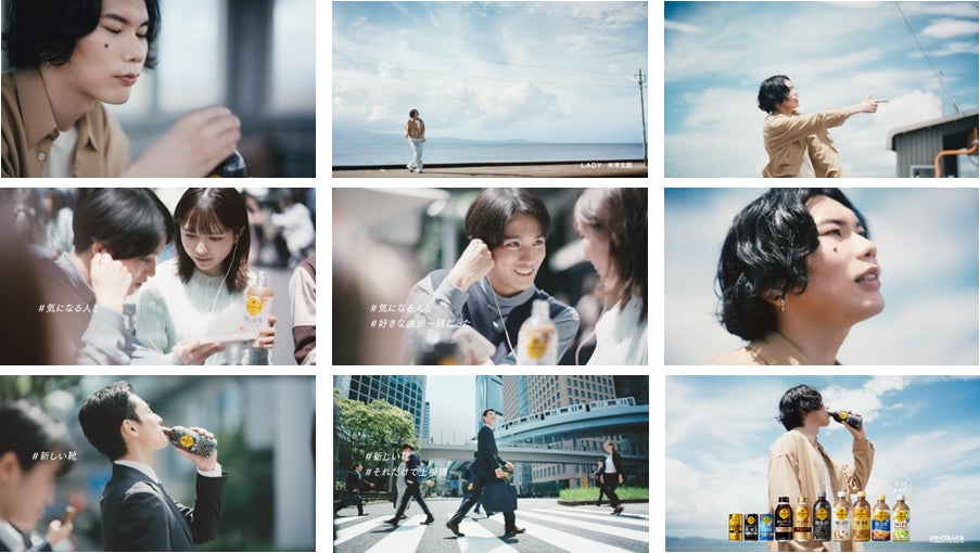 静かな海辺の駅で「ジョージア」を飲んで一息つく、米津玄師さん。夏の終わりが近づき、季節の変わり目を告げる秋風が、米津さんの近くを吹き抜けます。「コーヒーを飲んで、ふと思った。普通の一日なんて、きっとない。」という米津さんのナレーションが流れると、書き下ろし楽曲「LADY」を歌う米津さんの姿をきっかけに、さまざまな登場人物の日常が流れていきます。偶然にも気になる人と好きな曲が同じだったこと、新しい靴を履いて少し気分が上がる瞬間など、画面には、些細な日常の出来事が“かけがえのない瞬間である”ということを表すハッシュタグが添えられています。合間には、秋晴れの海辺で自由に歌い、踊る米津さんの姿も。最後は「コーヒーを飲んでふと思った、なんでもない私の、なんでもない日々だけど、“毎日って、けっこうドラマだ。”」と、「ジョージア」のブランドキャンペーンメッセージでCMが締めくくられます。