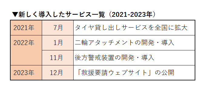 このお客さまの信頼にこたえるため、2021年7月にはタイヤ貸し出しサービスを全国に拡大し、2022年1月にはバイクをけん引できる「二輪アタッチメント」、同年11月に後方警戒装置の開発・導入、2023年12月には専用のウェブサイトからロードサービスを要請できる「救援要請ウェブサイト」の公開など、サービスを拡充してまいりました。
