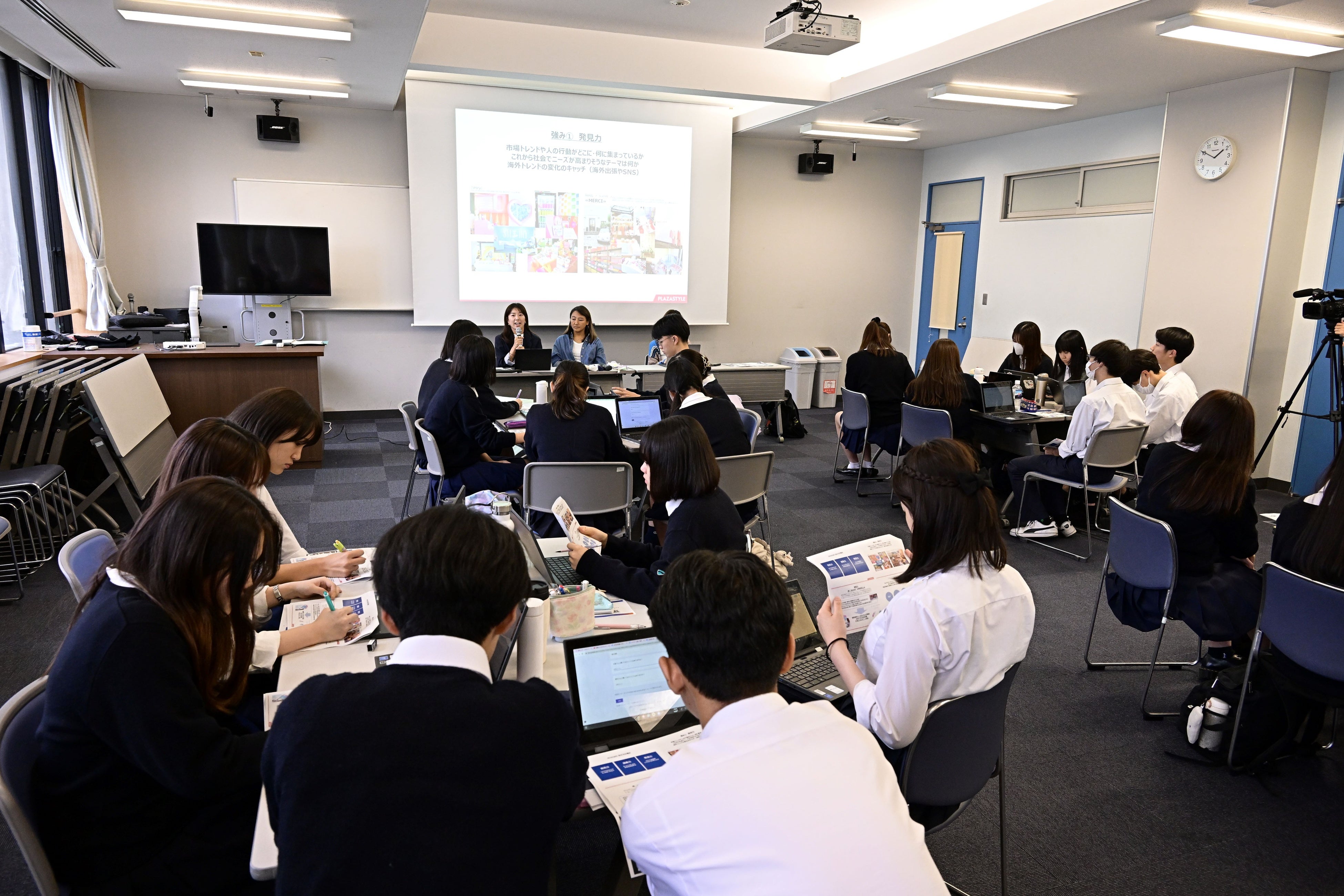 10月4日(水)、プラザスタイルのバイヤーとTBSのデザイナーが青山学院高等部において、「高校生のための日傘共同企画」実現のためのプロダクトデザインにまつわる第1回の授業を行いました。