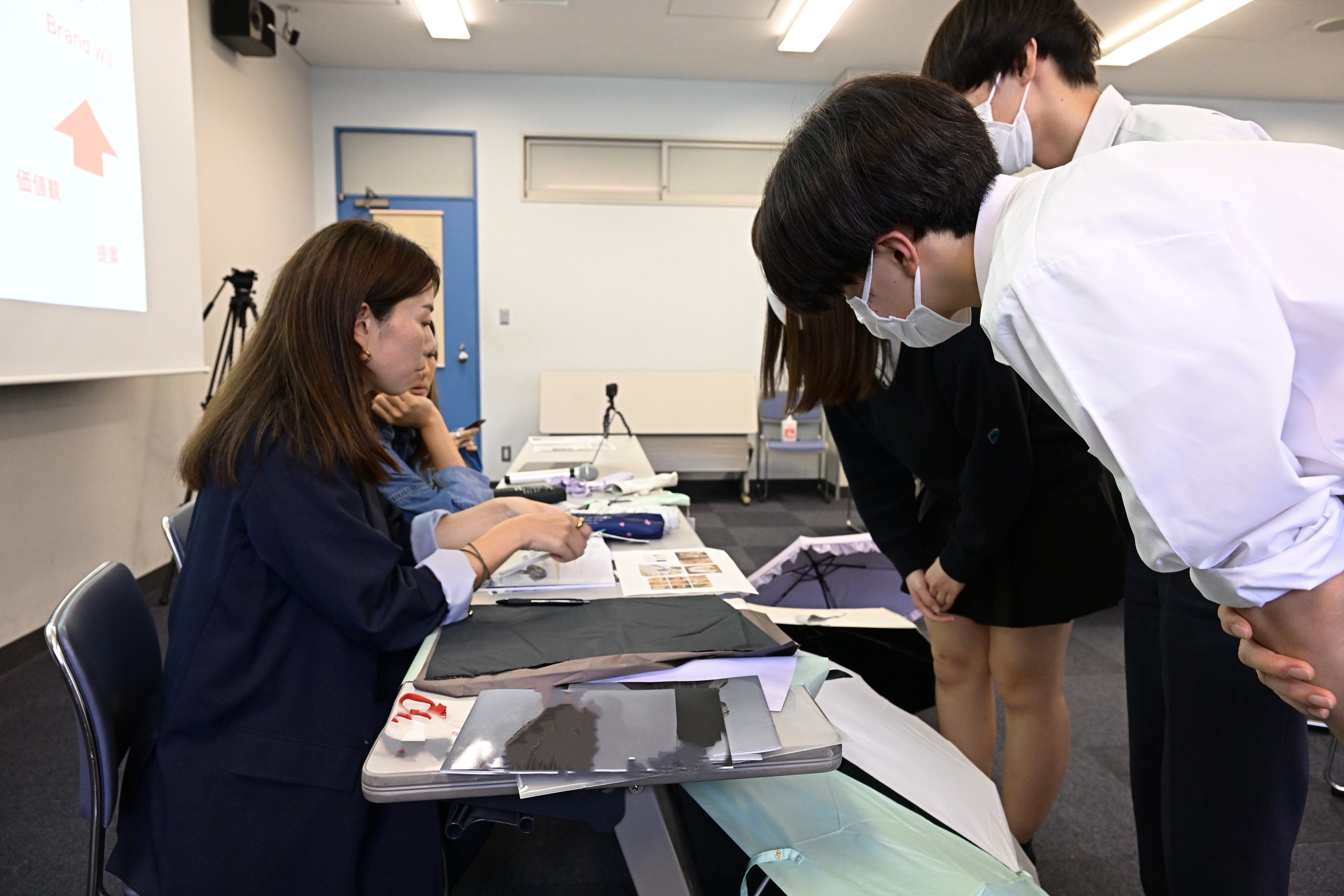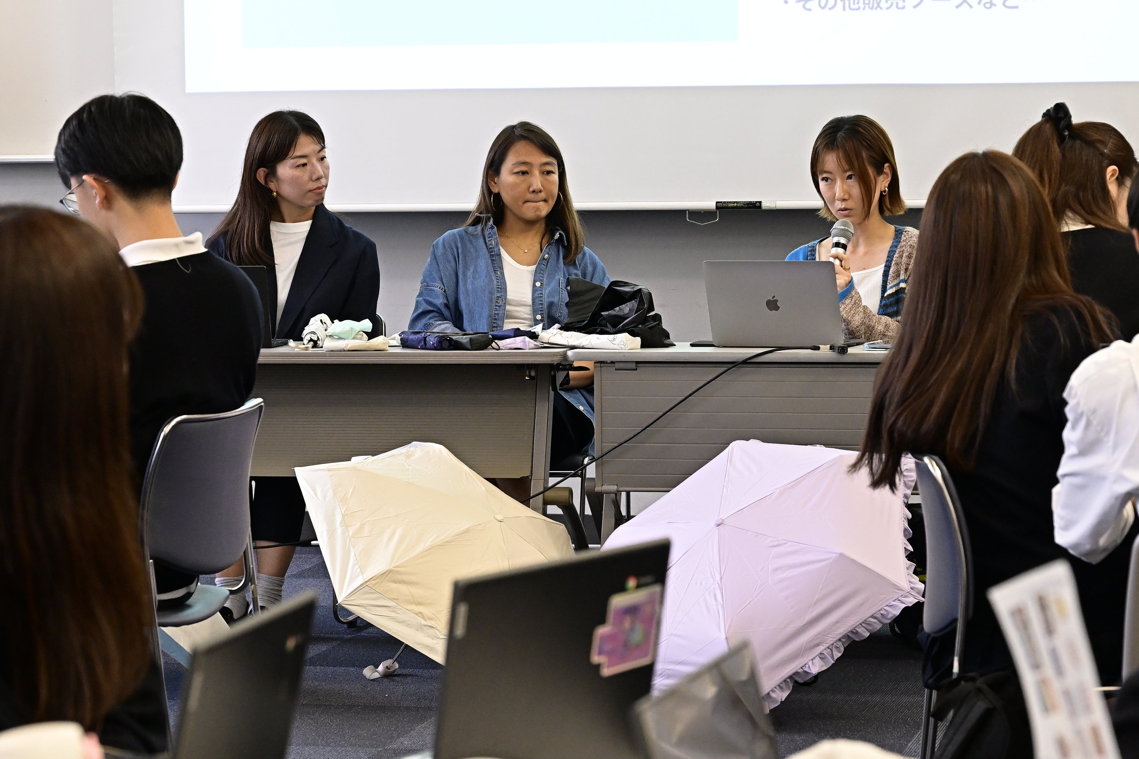 講義後は質問タイムでは「新商品開発のためのリサーチはどう行うのか?」「盗作にならないためにはどうすればよいか?」「晴雨兼用傘のメリット・デメリットは?」など、生徒の方々が素直な疑問を投げかけ、講師陣からより具体的なアドバイスを得ていました。続いて行われたグループディスカッションでは、自分の好きなものについて互いにプレゼンテーションを実施。その後は傘の生地見本をさわったり、講師に自分のアイデアを相談したり、参加した生徒の方々は生き生きとした表情で、ワクワクした雰囲気の中で授業を楽しんでいました。