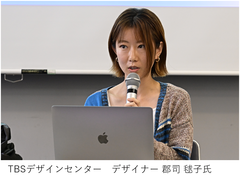 後半の講師は、TBSデザインセンターのデザイナー郡司毬子氏。担当した番組やイベントのデザイン実例を紹介。たくさんのアイデアの中から最終決定デザインに至るまでの思考回路や工程に、参加した生徒の方々も聞き入っていました。最初にテーマをしっかり決めることが大事で、そのことがのちに自分にも他者にもぶれずに「伝える」ことができるポイントとなるとアドバイスしました。
