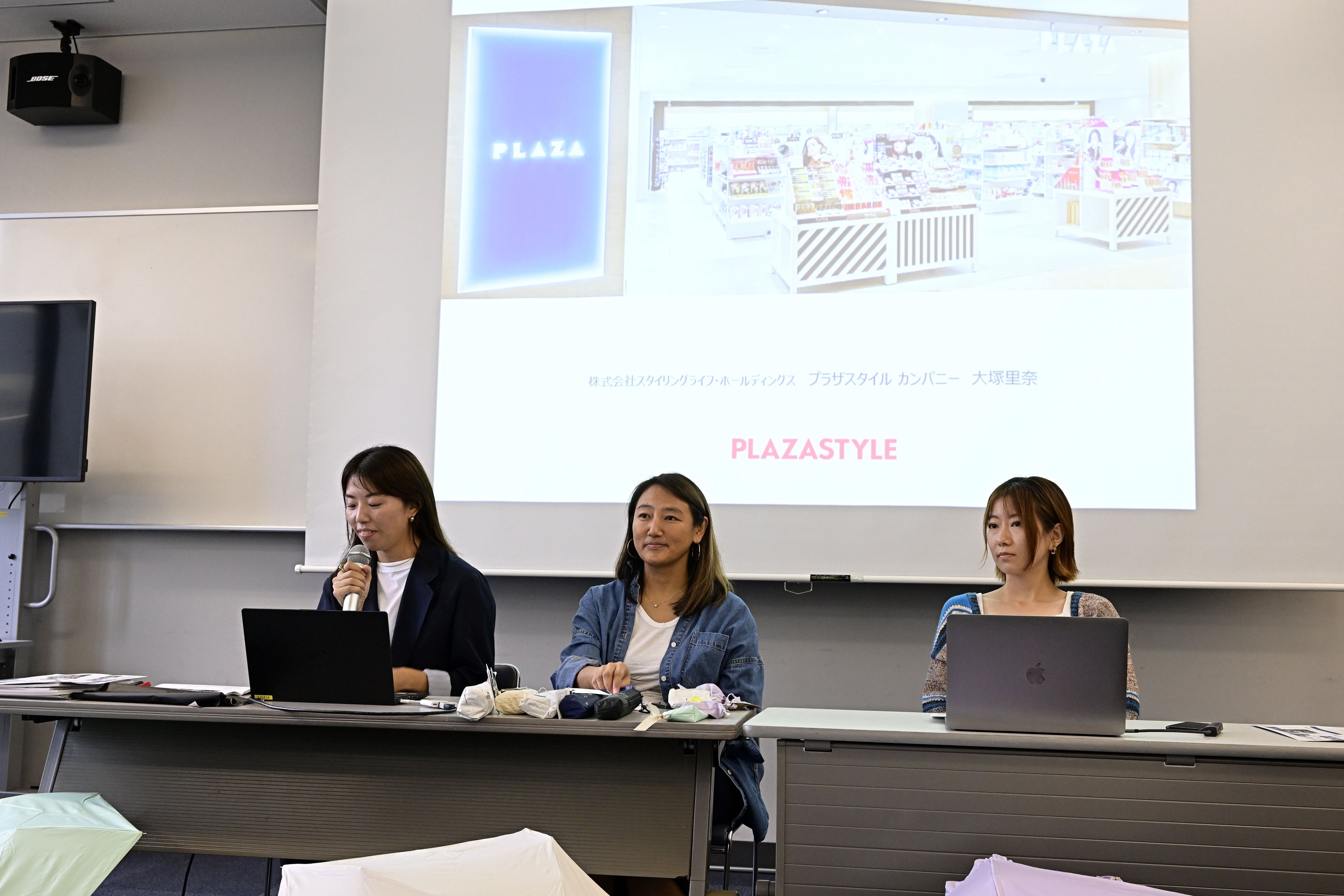 前半の講師を務めたのは、プラザスタイルのファッション&アパレルのバイヤー大塚里奈氏。PLAZAのヒットの実例や開発秘話とともに、プロダクトデザインについて話しました。日傘は近年売上が大きく伸⾧しており、気候変動や、肌環境・紫外線への意識の高まり、購買年齢層の広がりが起因しているといいます。