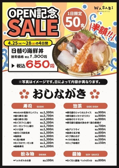 すしわさびに馴染みのない方にも気軽にお試しいただけるよう、オープンから4日間、一日限定50食の日替わり海鮮丼を半額にてご提供いたします。