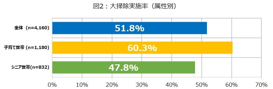 ・子育て世帯は全体より8.5%高い一方、シニア世帯の実施率は半数未満。