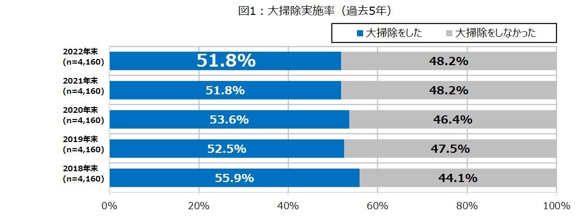 ・2022年末の大掃除実施率は51.8%。2021年末と同様、調査開始以来最低の実施率に。