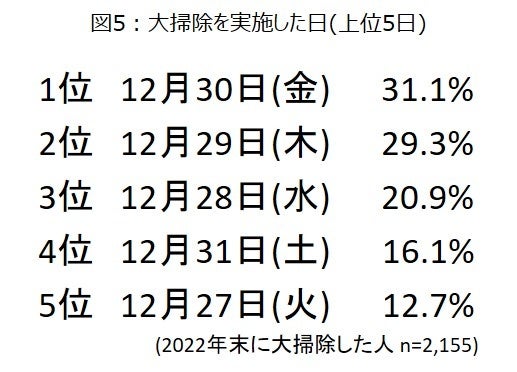 ・2022年末大掃除は平均2.7日間、平均8.3時間、12月最終週での実施が多数派。
