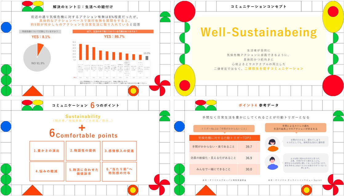 より生活に紐づいた内容であるほど、生活者の行動に繋がっていることから、生活者が無理なく気候危機アクションに参画しやすくなるための新しいコミュニケーションコンセプトとして、「Well-Sustainabeing」(心地よさとサステナビリティの両立)を提唱。