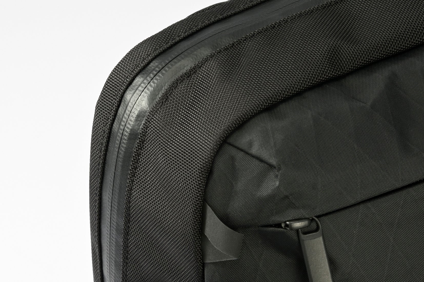 表面のナイロン生地に、引き裂き強度を高めるX字状のポリエステルファイバーと、防水性に優れたフィルムを組み合わせた3層構造で構成されており、軽量性・耐久性・防水性を兼ね備えています。