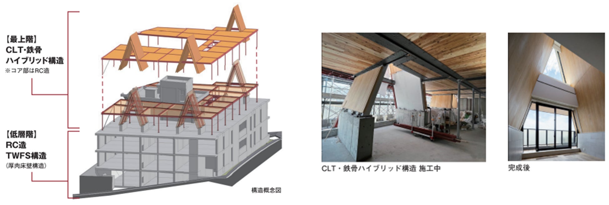 明治神宮の杜を望む参宮橋の高台に計画された、本格的に木材を構造材に採用した全19 戸の都心分譲集合住宅。地下2 階~地上3 階は、十分な剛性と強度を有し、遮音性に優れたRC 造(厚肉床壁構造)とし、最上階4階のコア部を除く主要構造部に、大成建設株式会社が独自に開発した木質構造「CLT・鉄骨ハイブリッド構造」を採用。RC や木材の利点を適材適所で使い分け、集合住宅に求められる高い性能を確保し、魅力的な住空間と環境貢献も同時に実現した。