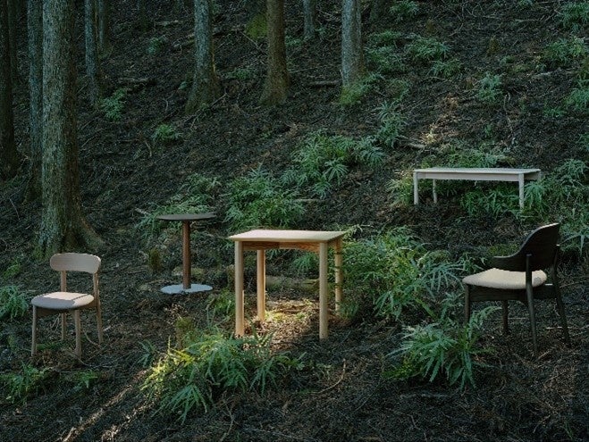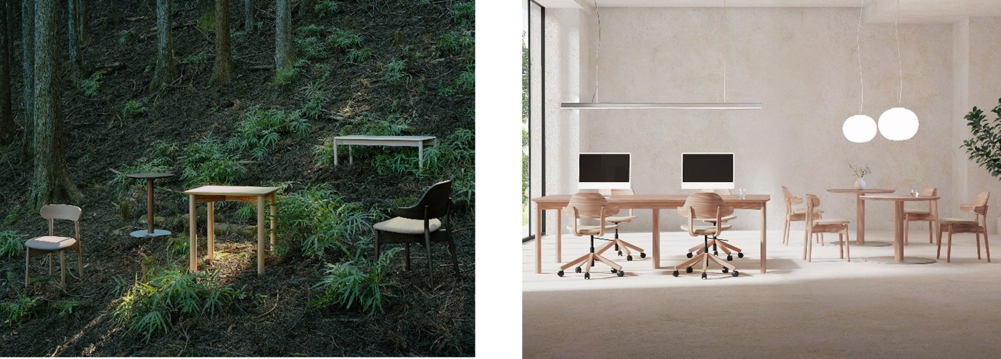 野村不動産グループが東京都・奥多摩町に保有し、森林経営から木材活用を担う「つなぐ森」の針葉樹未利用材を用いた家具※1。カリモク家具株式会社及び株式会社芦沢啓治建築設計事務所と共同で開発。気候変動問題を背景に、これまでバイオマス燃料として燃やされていた小径・節有材を使い、炭素貯蔵量や木材の利用価値向上を通した社会インパクトの創出と野村不動産グループの企業価値向上を目指す。