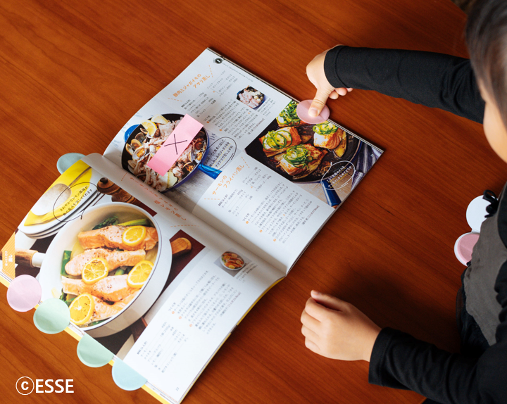 家族に料理本を渡し、食べたい料理にふせんをはってもらいます。「手間のかかるものは×印をつけて選べないように。悩んだ日は人気料理にすれば喜ばれ、モチベーションアップ」