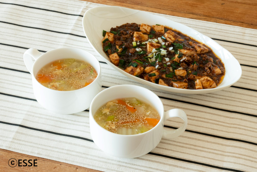 麻婆豆腐と中華スープ、豚の梅チーズ焼きとお雑煮など家族が好きな定番ペアを数パターン用意。「迷ったらどれかにすればOK。さらにプラスできるお守り食材があれば安心です」
