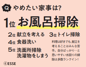 ESSE読者312人へのアンケートの結果から、やめたい家事ベスト5が発覚。第1位は「お風呂掃除」という結果に。自分ばっかり…と思いやすい水回りの掃除は多数ランクイン! 料理は好きでも、献立を考えることはみんな苦手なよう。