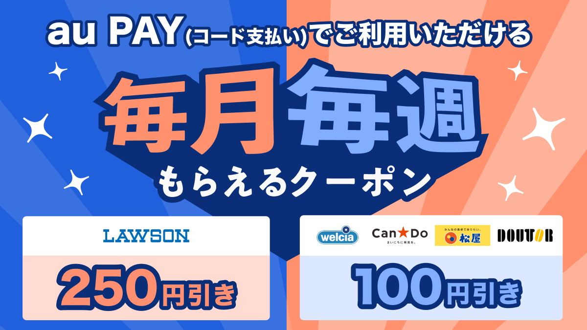 au PAYでご利用いただけるクーポンを毎週月曜日にプレゼントします。 12月・1月はウエルシアや、Can☆Do(キャンドゥ)、松屋フーズ、ドトールコーヒーグループなどの小売店や飲食店でご利用いただけるクーポンをプレゼント。