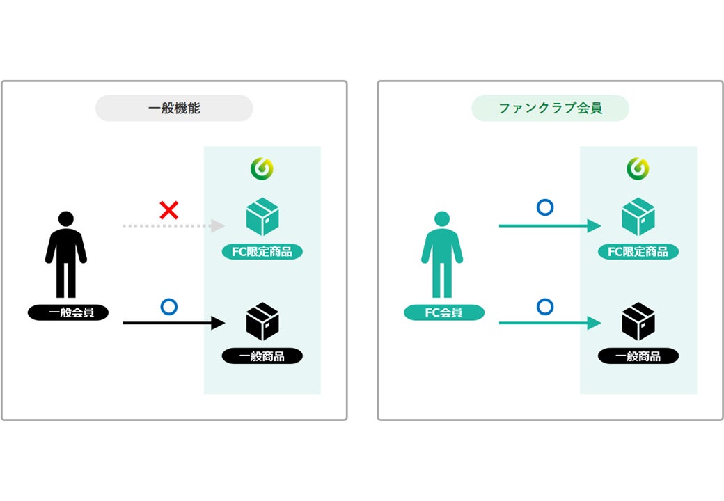 FC等の会員情報で認証を受けたユーザー以外は、FC会員限定商品を購入できないよう制御する機能です。一般ユーザーにもFC会員限定商品を公開し、FCクラブ入会のダイアログ表示を行うことにより、会員化を促すことができるようになります。購入制限機能と組み合わせることで過度なグッズ流通を抑制することも可能です。