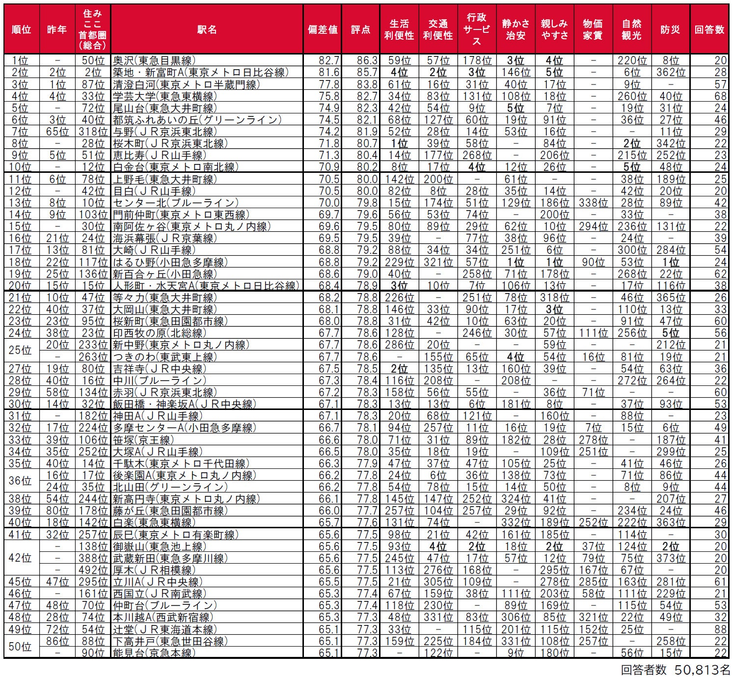 ●1位と2位は偏差値80台の極めて高い評価、また、3位~13位までの駅も、偏差値が70台の高い評価を得ています。また、14~50位の駅も偏差値60台で相対的に子育て世帯にとって住みここちが良いという評価になっています。