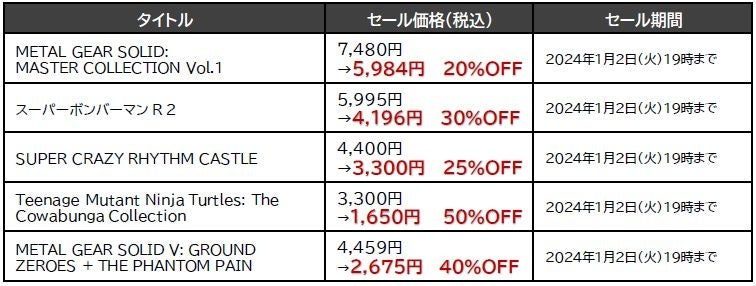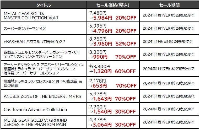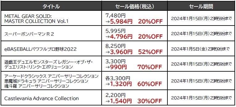 2023年に発売した『METAL GEAR SOLID: MASTER COLLECTION Vol.1』や『スーパーボンバーマン R 2』などの他、『eBASEBALLパワフルプロ野球2022』、『遊戯王デュエルモンスターズ レガシー・オブ・ザ・デュエリスト:リンク・エボリューション』、「悪魔城ドラキュラ」シリーズ、「メタルギア」シリーズ、 「アニバーサリーコレクション」シリーズなどなど、KONAMIの人気タイトル・シリーズがお買い得になっています。