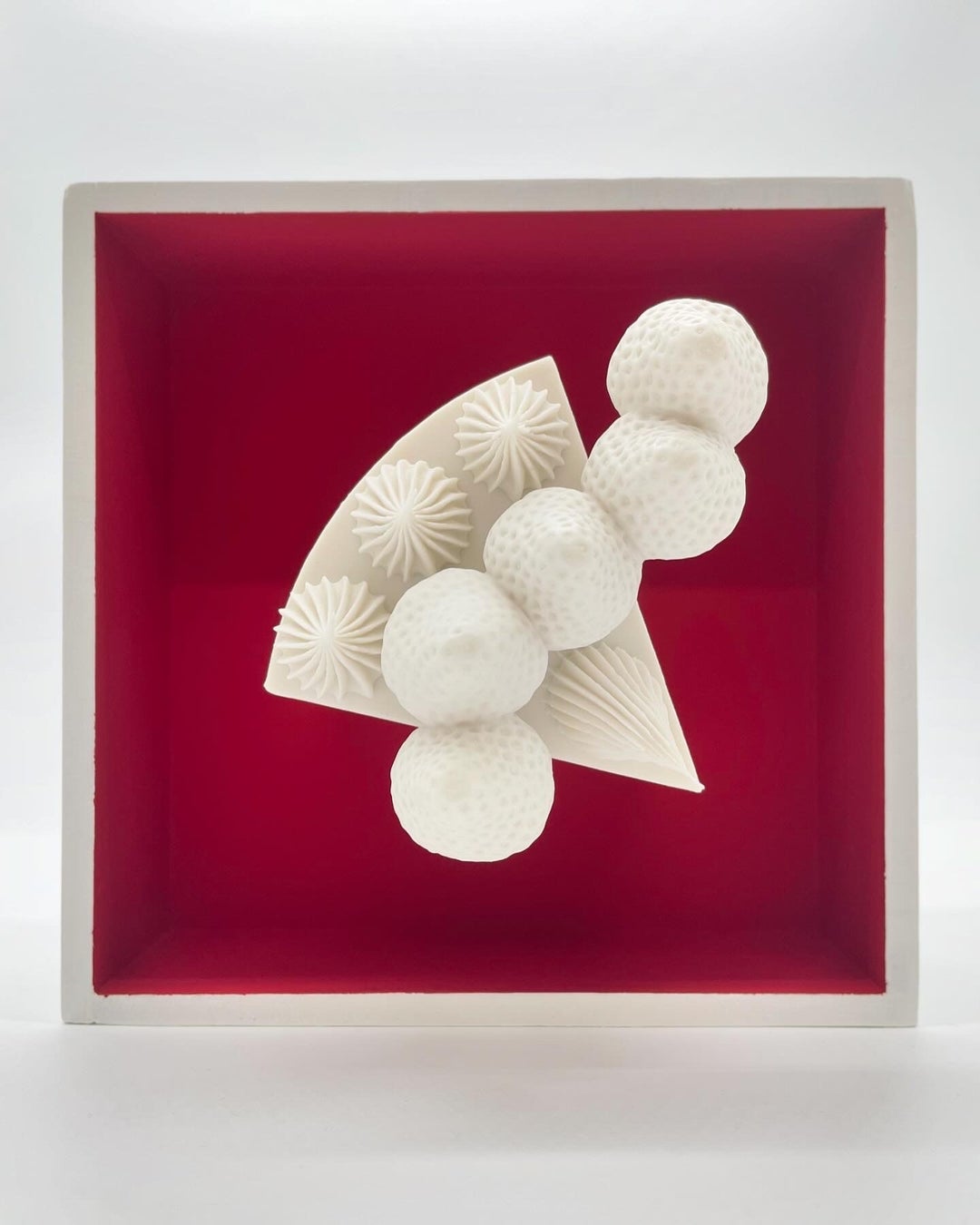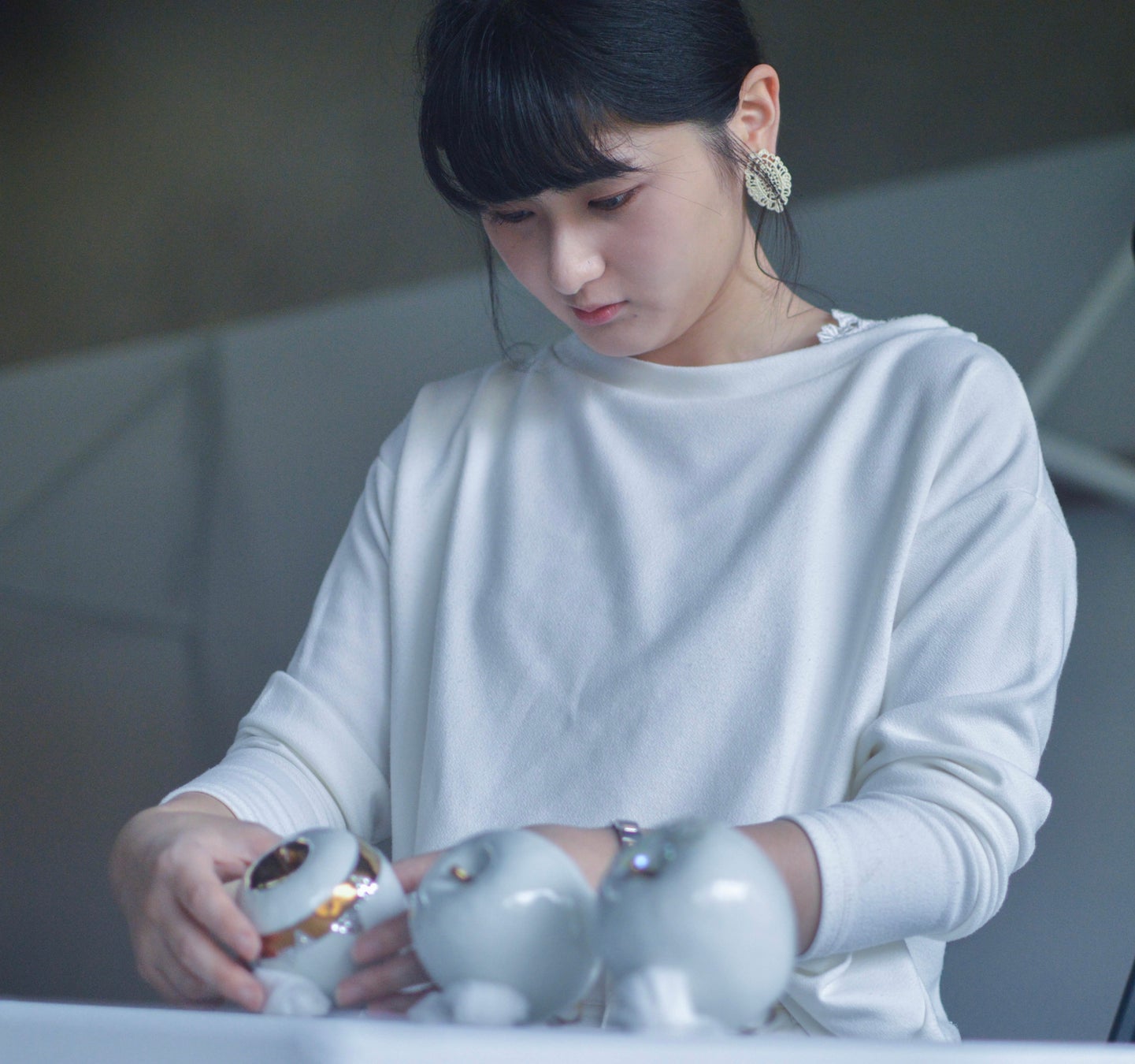 日常や特別な日などに、その作品があるだけで心がときめく様な、人の生活を豊かにする作品をつくることをテーマに制作をしています。近年は「器とそこに盛られるものの関係性」に着目し、制作のコンセプトにしています。陶磁器の器に盛られるものの素材を器と同じ陶磁器にすることによってできる、器とそこに盛られるものの関係性の変化。皆さんの生活に欠かせない身近な素材の陶磁器を使うからこそ生まれる違和感の面白さ。実際にはありえない、陶磁器という素材で作るからこそできる造形の面白さを楽しんでいただければ嬉しいです。