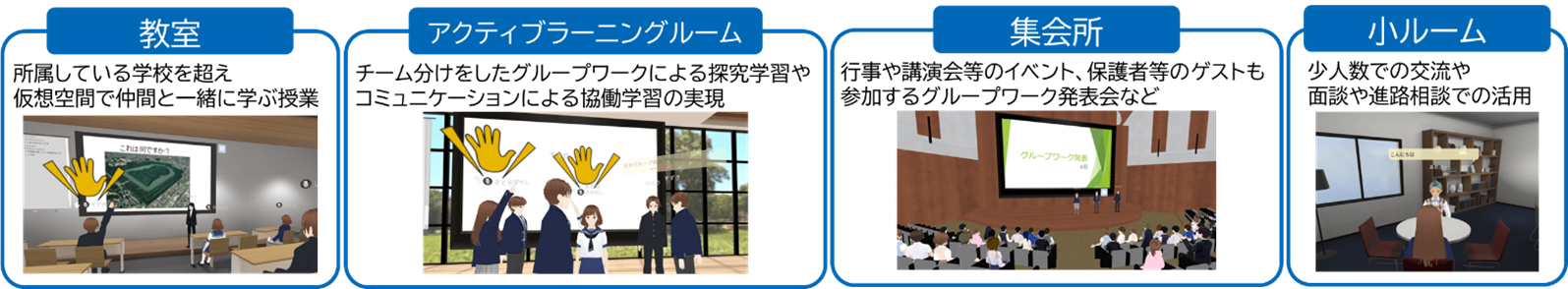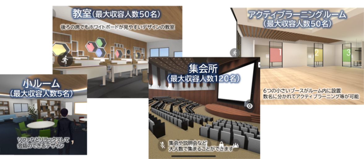 実証にて採用する3D教育メタバースは、探究学習やアクティブラーニング、他校との交流授業などで活用いただけるよう教室や集会所、小ルーム(面談室)、アクティブラーニングルームなど、教育に特化した仮想空間を提供しており、授業や全体集会、グループワークや面談といった学校特有の様々なシーンでの活用が可能なサービスです。