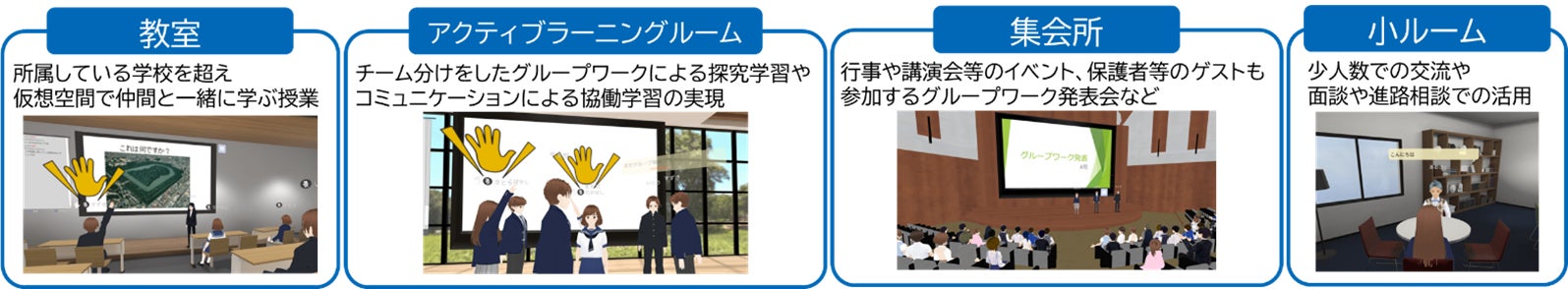 仲間の存在や距離を実感できる臨場感のある3Dメタバース空間を活用し、性別や容姿を気にせず自己表現ができるアバターを通じたコミュニケーションによって、協働的な学びの授業や行事等に活用していく予定です。