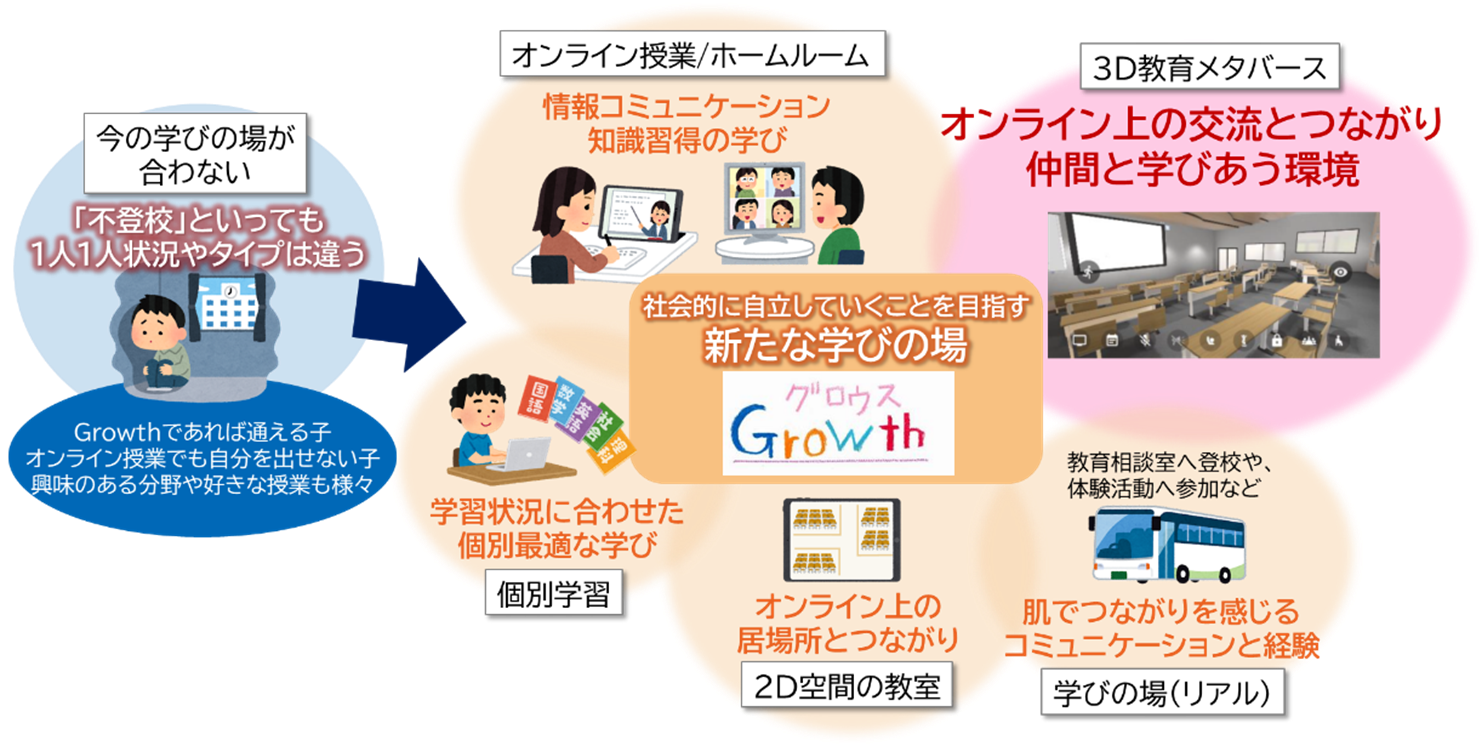 このような背景から、Growthでは、実証事業※1を活用し、不登校の児童生徒の新たな学び舎を確保できないか検討致しました。無線LAN環境の構築等でGrowthの活動を支えてきたNTT東日本は、Growthの教職員から「実証に向けて、2D空間ではなくよりリアルな空間で臨場感のある交流ができるメタバースがないか」、との相談を受け、NTTスマートコネクトと連携し3D教育メタバースの導入、活用シーンのコーディネートをしてきました。今後も、Growthのめざす「新たな学び舎」の実証実現に向けて、NTT東日本とNTTスマートコネクトが連携して支援をしてまいります。