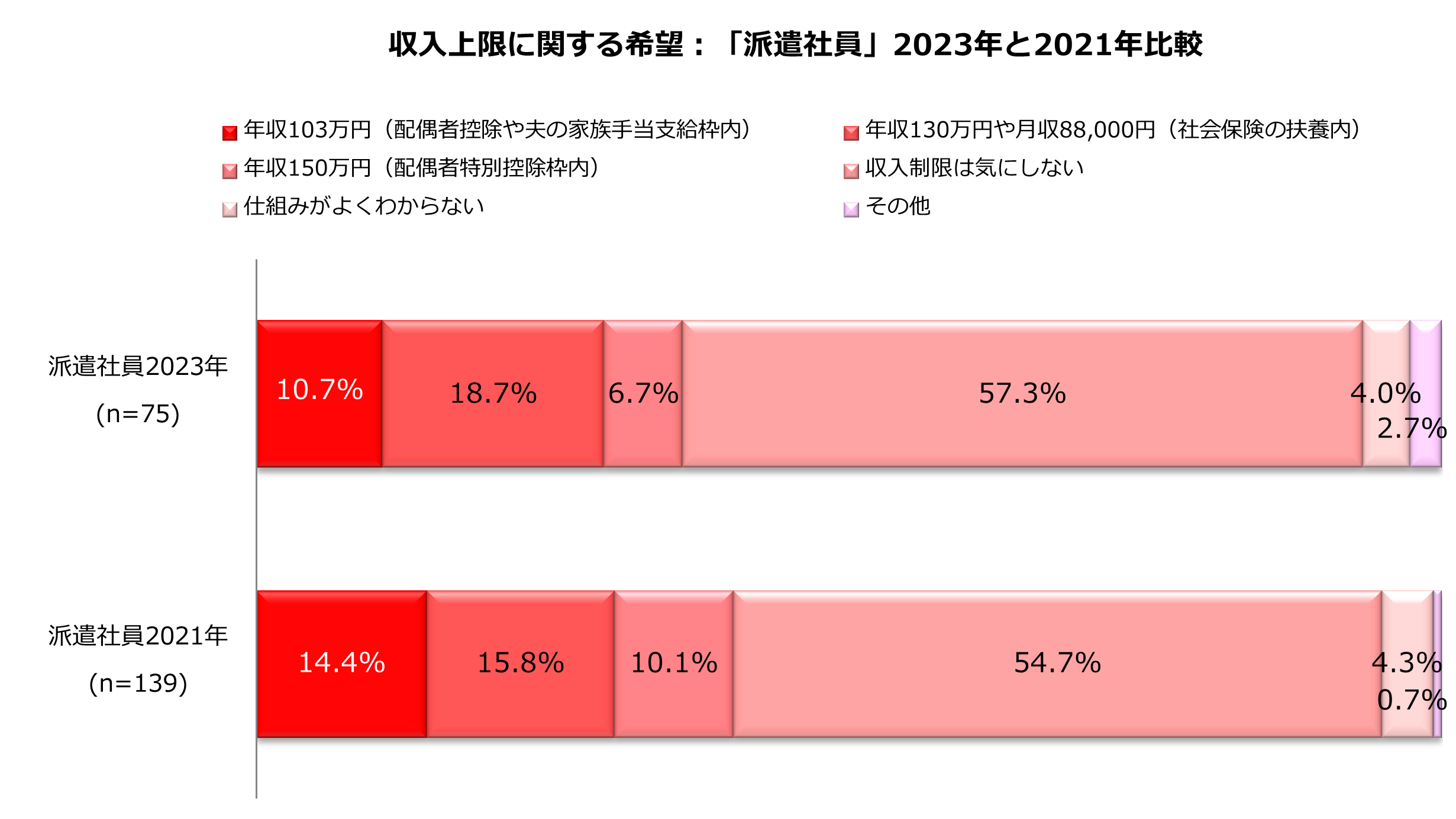 年収130万円など、扶養枠の年収上限の見直しが議論されています。仕事と家庭の両立を希望する主婦・主夫層に、「現在のあなたの収入上限に関する希望をお教えください」と尋ねたところ、「収入制限は気にしない」と回答した人が最も多かったものの、103万や130万など扶養枠の上限に抑えることを希望している人の合計は過半数となりました。また、現在の働き方に関する属性質問で回答の多かった上位3つを比較したところ「収入制限は気にしない」と回答した人の比率は「パート/アルバイト」が20.2%だったのに対し「派遣社員」は57.3%と大きな差がありました。時給が比較的高い(※1)派遣社員として働いている人は、収入制限を気にしない傾向が強いようです。さらに働き方別で2021年の調査(※2)と比較すると、 「パート/アルバイト」は「収入制限は気にしない」人の比率が7.6ポイント減少したのに対し、「派遣社員」は2.6ポイント増加しました。比較的時給が抑えられがちな「パート/アルバイト」は扶養枠内に収める方向にシフトし、比較的時給が高い「派遣社員」は扶養枠を外す方向へとシフトする二極化の傾向が見られます。