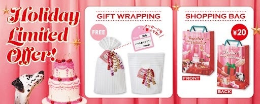 ホリデー限定のギフトラッピング(無料)や、ショッピングバッグ(20円(税込))も登場!この時季だけのワクワクなお菓子を手にして、ホリデー気分を盛り上げよう!