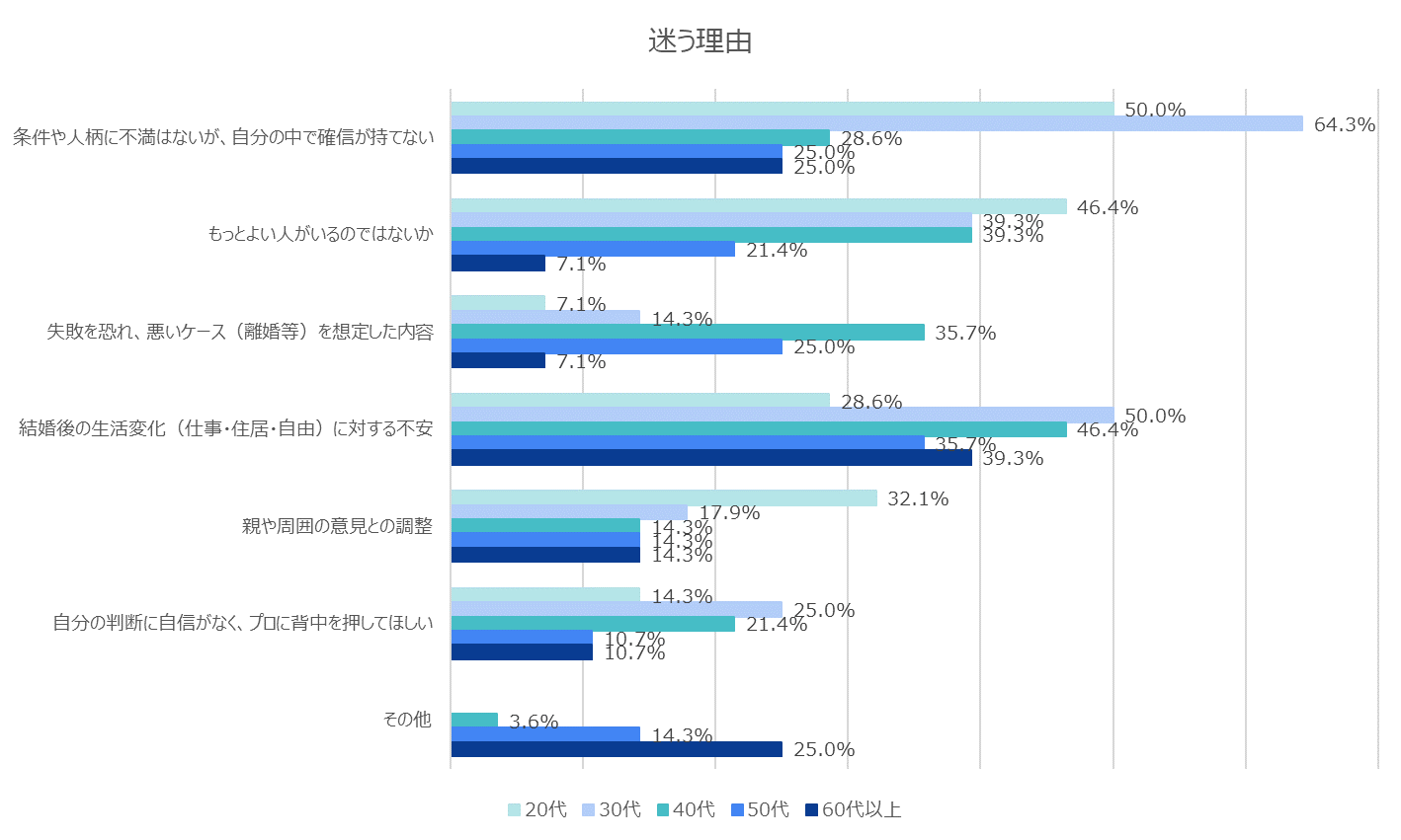 世代によって迷いの内容には明確な違いが見られました。20代、30代では「条件や人柄に不満はないが、自分の中で確信が持てない」が最も多く20代で50.0%、30代で64.3%でした。一方、40代、50代、60代では「結婚後の生活変化(仕事・住居・自由)に対する不安」が最も多く、それぞれ46.4%、35.7%、39.3%となりました。