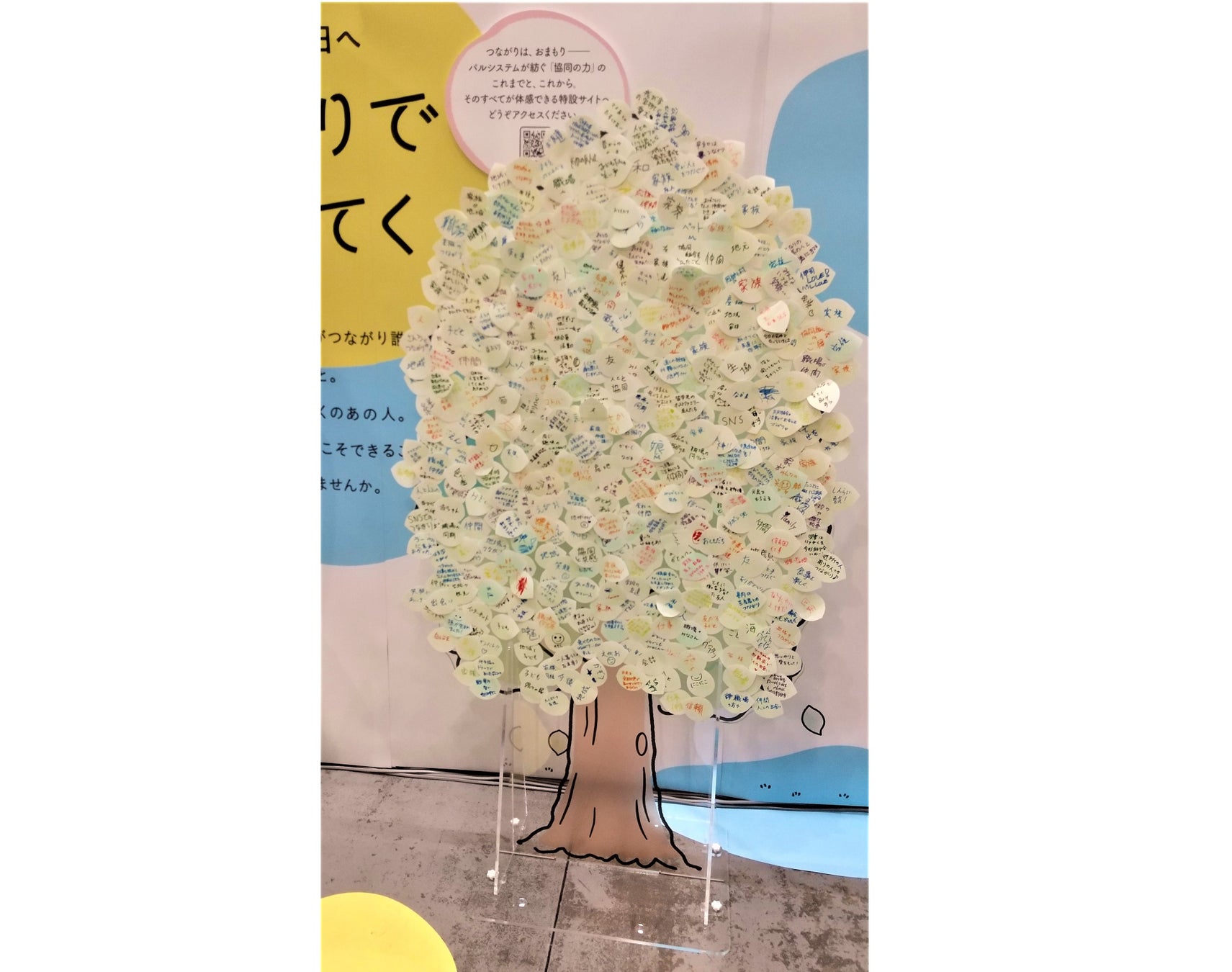 来場者から募集したメッセージは、それぞれが大切に思う「つながり」などのエピソードです。家族や友達、趣味でつながった仲間のことなど、葉っぱ型の付箋に書かれた言葉がメッセージツリーの一葉となり、集まるにつれて彩られていきました。まだ字の書けない子どももペンを取り、あらゆる世代の人が400枚以上の葉っぱを張り付けてくれました。