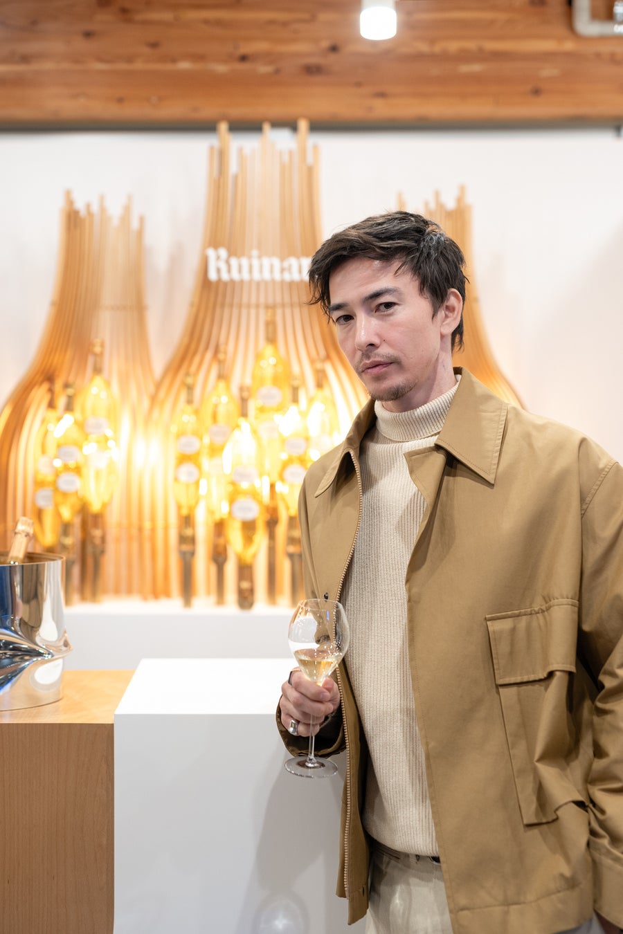 Annex Aoyamaでの展示は、暗い空間の中で耳から入る音に集中するという体験が非常に新鮮でした。普段サーフィンをしている私にとって、海の上ではなく、海の中の音を聴くというのはとても嬉しい体験で、『海ってこんな音をしているんだ』と新たな発見がありました。大倉集古館の作品の表現は、あえてグレースケールに近い色合いで、色を排除して形だけで向き合う体験がすごく楽しかったです。今回の展示や写真を通じて、ルイナールというメゾンがいかにアートを大切にしているかを感じました。ルイナールのシャンパーニュは、フレッシュでありながらしっかりとしたボディがあり、その絶妙なバランスが魅力的です。この上品な味わいを、かしこまった場だけでなく、友人たちとカジュアルに、塩味のきいたおつまみと一緒に楽しみたいです。