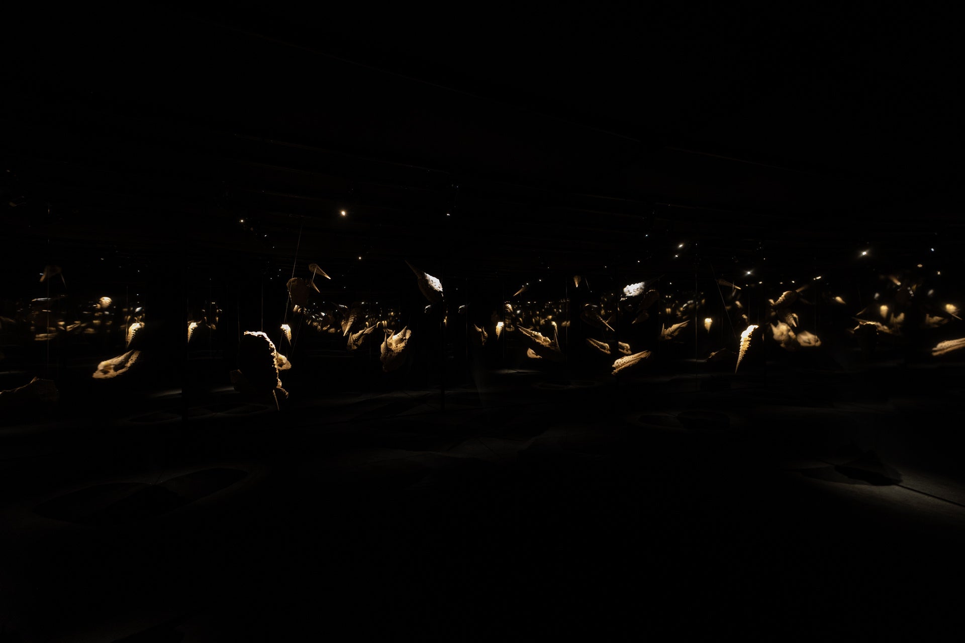 この度、ルイナールからのご招待でシャンパーニュ地方を訪れることができ、とても興味深い体験となりました。母がシャンパーニュ地方出身ということもあり、子供時代の記憶が鮮やかに蘇りました。特に秋になると畑が耕され、そこから現れる海の化石を集めていたことを覚えています。Annex Aoyamaのインスタレーションでは、この場所を『生きている場所』として捉え、現代のサンゴ礁の水中音と海の生物の歌声を融合させました。来場者の皆さまにも水の中にいるような感覚になる空間をお楽しみいただきたいです。大倉集古館に展示した作品は、その音を録音した場所の『肖像画』であり、死んだサンゴを砕いて顔料とし、地層が積み重なるプロセスを再現しています。この作品が、皆さんが日常の中で見逃している“表面の下に隠されたもの”に耳を傾けるきっかけとなれば幸いです。