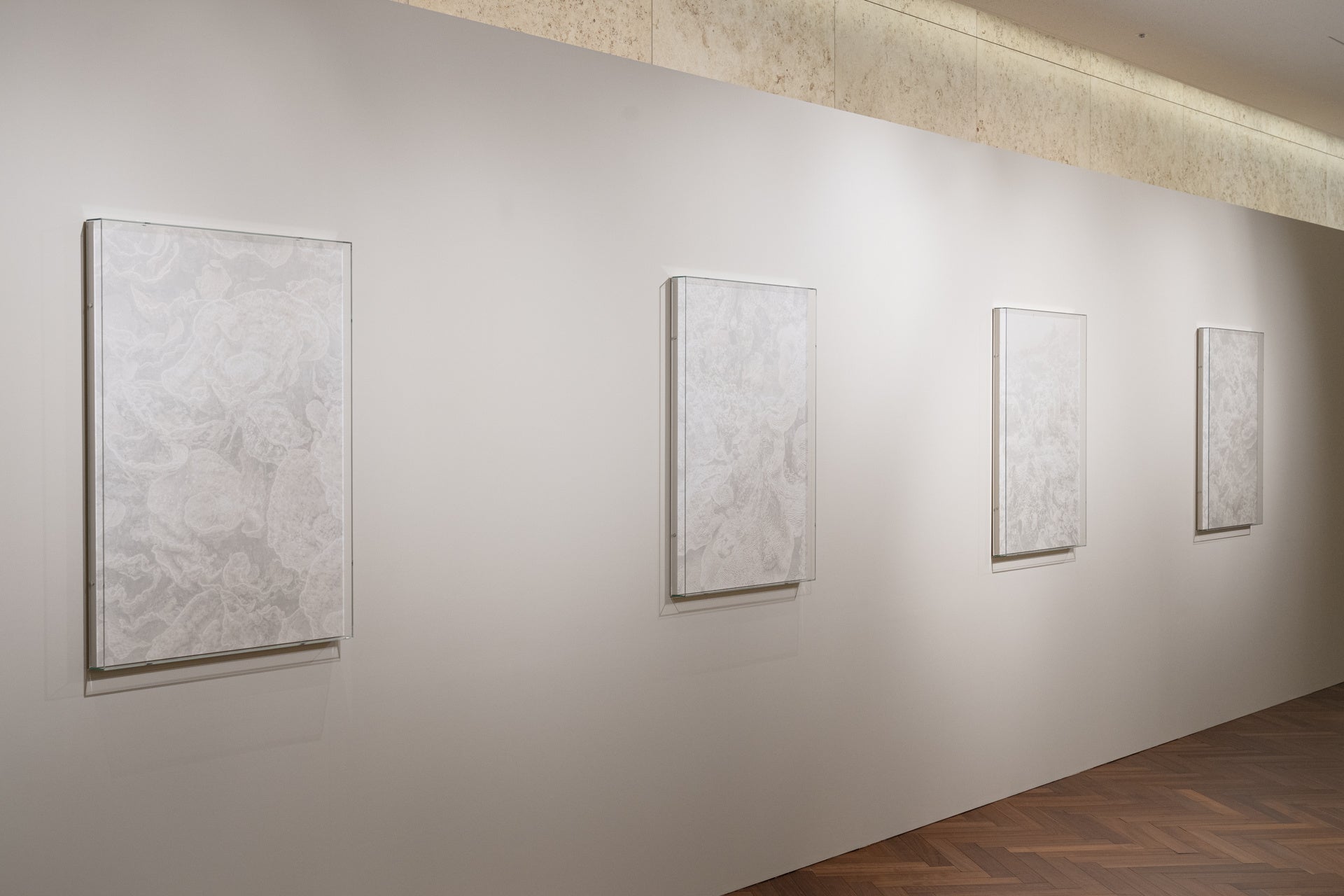 本展では、クレイエルのチョークの壁に眠る化石のささやきを呼び覚ますような体験型のサウンド・インスタレーションや、世界各地のサンゴ礁を撮影したデジタル画像を、白亜・石灰岩・サンゴ由来の顔料で再解釈した版画作品などを展示。版画作品の淡く漂白されたような色調は、保存と喪失の狭間にある儚さを象徴しています。