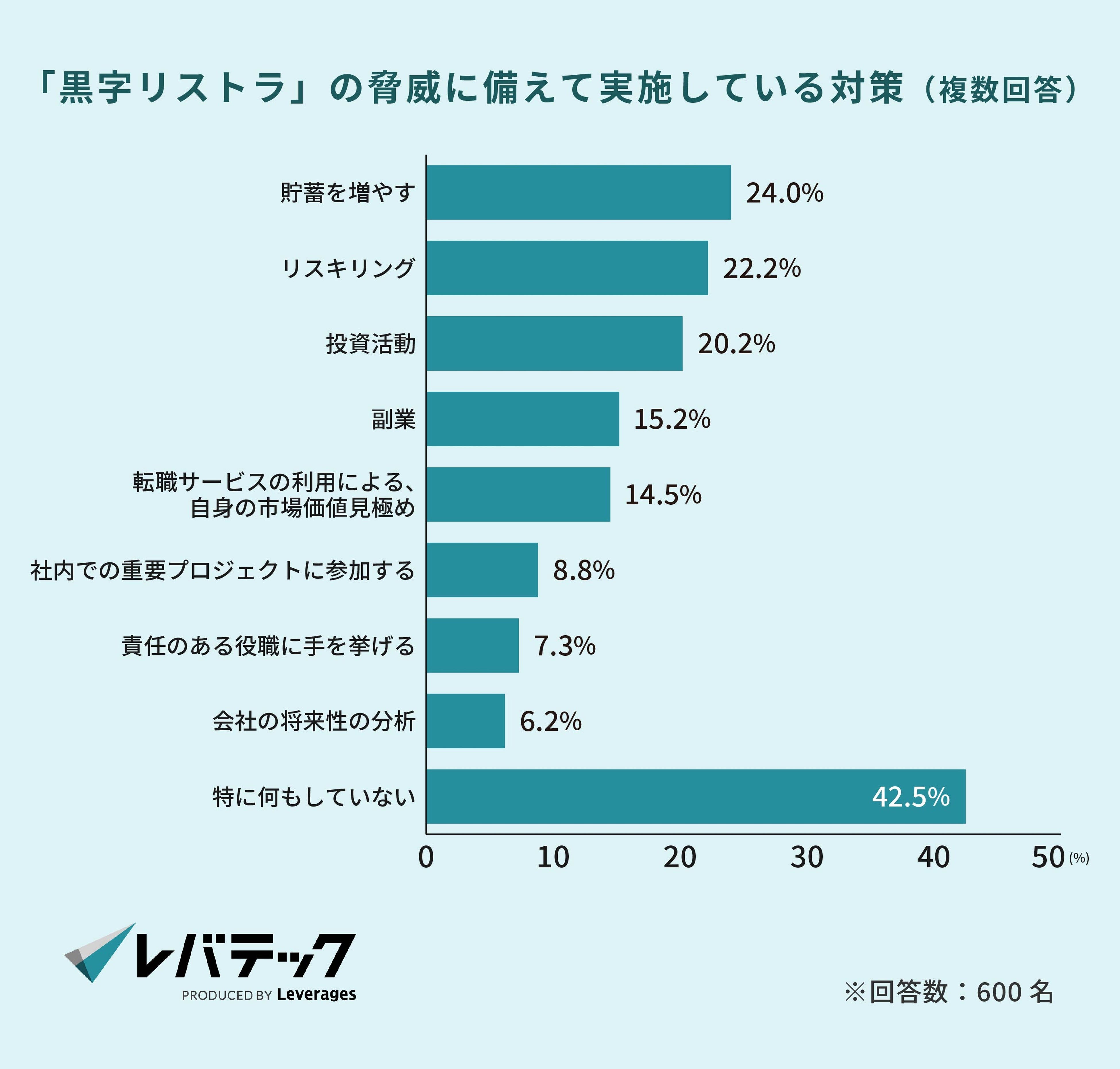黒字リストラに備えて実施している対策は「特になし(42.5%)」を除くと「貯蓄を増やす(24.0%)」が最も多い結果となりました。「リスキリング(22.2%)」や「副業(15.2%)」なども挙がり、新たなスキルや収入源の確保などといった手段でリスクに備えている人もいることが分かります。
