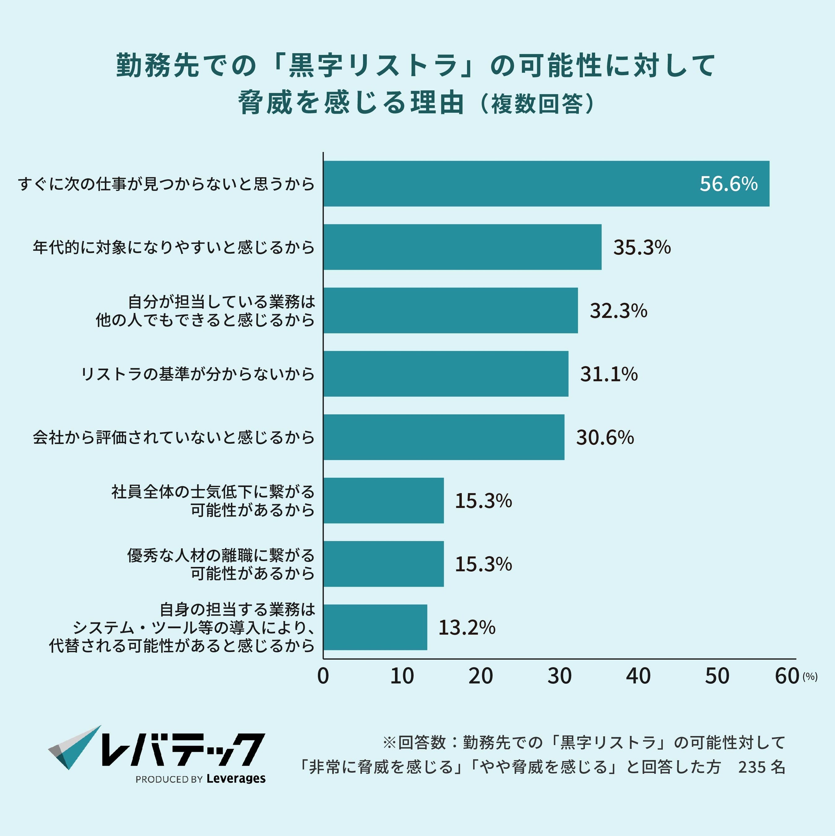 脅威を感じる理由としては「すぐに次の仕事が見つからないと思うから(56.6%)」が最多で、次いで「年代的に対象になりやすいと感じるから(35.3%)」「自分が担当している業務は他の人でもできると感じるから(32.3%)」と続きます。