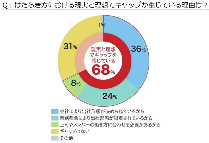 調査を通して、約7割の人がはたらき方において現実と理想のギャップを感じていることが分かりました。ギャップが生じている理由は、「会社により出社形態が決められているから」36%、「業務都合により出社形態が限定されているから」24%、「上司やメンバーのはたらき方に合わせる必要があるから」8%。出社形態が業務特性上限定的にならざるを得ない人を除き、会社から決められている人や周囲に合わせている人は、本来であればはたらく場所を自ら選択する余地があるにも関わらず、自分の意志で決められていません。そのことが不満要因になっており、多くの人にとってはたらく場所を主体的に選びたいと思っていると言えます。