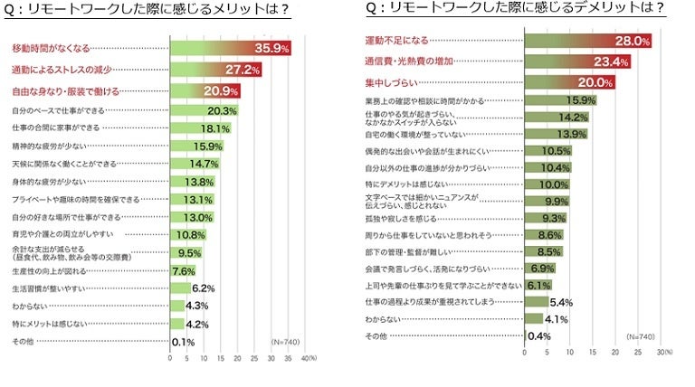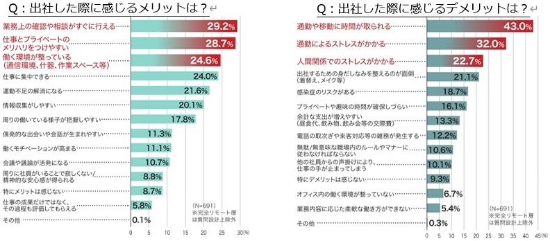 はたらき方に望むことを探るため、出社とリモートワークのメリット・デメリットを調査しました。出社のメリットでは、「業務上の確認や相談がすぐに行える」がトップ。次いで、「仕事とプライベートのメリハリをつけやすい」、「はたらく環境が整っている」が続きます。デメリットとして上位にあがったのは、「通勤や移動に時間が取られる」、「通勤によるストレスがかかる」、「人間関係でのストレスがかかる」でした。一方で、リモートワークのメリットは、「移動時間がなくなる」が一番多く、次いで「通勤によるストレスの減少」、「自由な身なり・服装ではたらける」でした。デメリット は「運動不足になる」がトップでした。