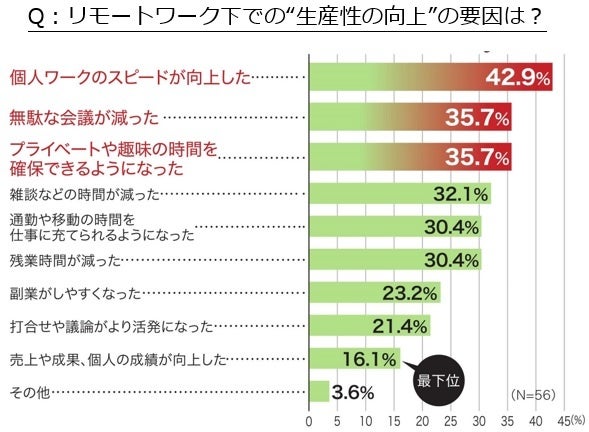 リモートワークのメリットとして「生産性の向上が図れる」と回答した人のうち、その理由で一番多かったのは「個人ワークのスピードが向上した」。「無駄な会議が減った」、「プライベートや趣味の時間を確保できるようになった」が同率2位でした。「売上や成果、個人の成績が向上した」は最も低い結果となりました。この結果から、リモートワークによって移動や通勤時間がなくなった分、自由に使える時間は増えたものの、会社側が期待する「生産性」は向上していないと言えます。多くの人にとっての生産性とは、プライベートを含めた“1日を通して得られる達成感” を指し、会社とワーカーとの間で“生産性” の認識に差があることがこの結果から読み取れます。
