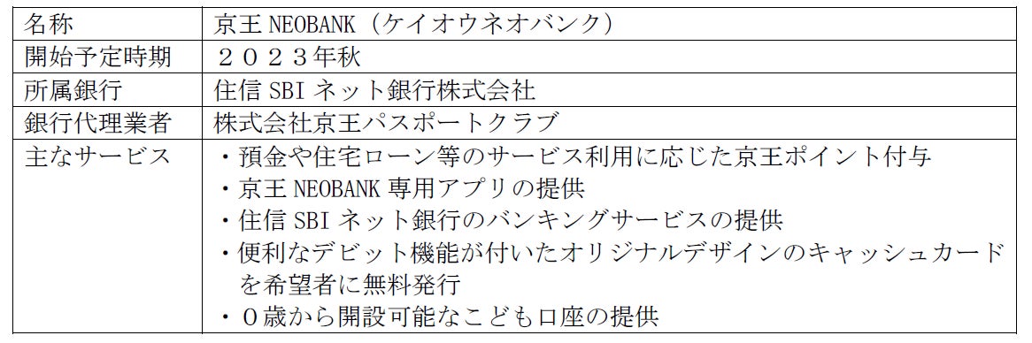 京王電鉄株式会社(本社:東京都多摩市、代表取締役社長:都村 智史、以下「京王電鉄」)は、株式会社京王パスポートクラブ(本社:東京都渋谷区、代表取締役社長:安永 克彦、以下「京王パスポートクラブ」)と住信SBIネット銀行株式会社(本社:東京都港区、代表取締役社長(CEO):円山 法昭、以下「住信SBIネット銀行」)とともに、関係当局の許認可取得を前提として、住信SBIネット銀行が提供する「NEOBANK®」サービスを活用した新たな金融サービス「京王NEOBANK」を2023年秋から提供します。