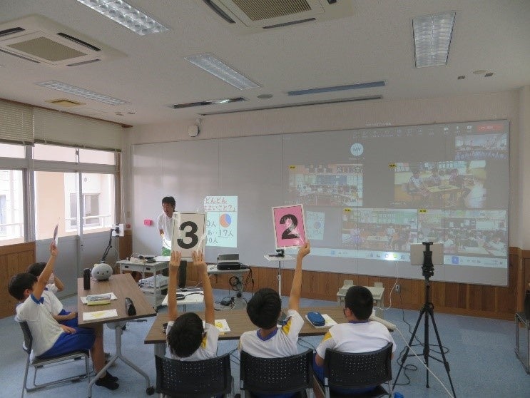 このオンライン合同学習は、児童がテクノロジーとの関わり方について、文章を読み取ることやお互いに対話することを通して、多角的に考えたり、さらに深く考えたりする力を養うことを目的とした学習内容でした。大蔵小学校、御蔵小学校、明和小学校、萩野小学校、新盛小学校の計5校の児童約30人が、このオンライン合同学習の特別授業に参加しました。