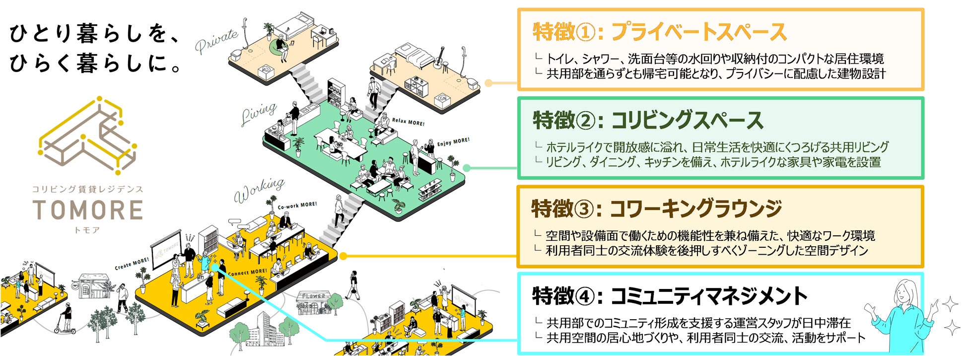 今後も、「TOMORE」は都心部で暮らす20~30 代の社会人単身者に向け、新たな「一人暮らしの選択肢」を提供してまいります。