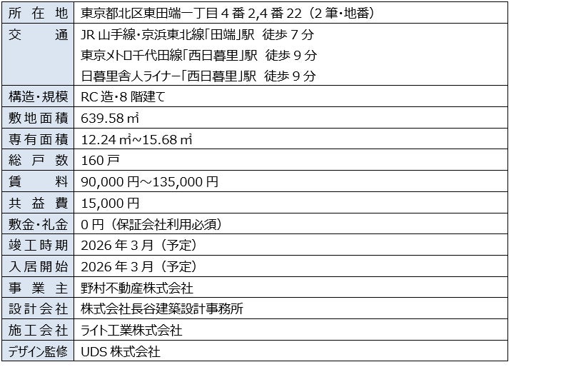 野村不動産株式会社(本社:東京都港区/代表取締役社長:松尾大作、以下「当社」)は、2025 年2 月に竣工した「TOMORE 品川中延(東京都品川区)」に続く、コリビング賃貸レジデンス※1 第2 弾として、利便性の高い山手線沿線に、総戸数160 戸の大規模物件「TOMORE 田端」(本物件)を新たに発表いたします。