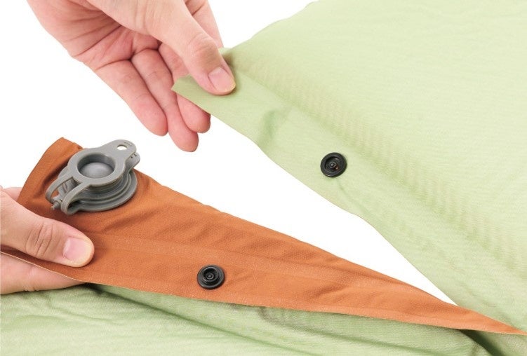 自動で膨らむ最高レベルの高弾力マット。キャンプ場の地面の硬さや凸凹、冷気を軽減する。好みにあわせてグリーンとブラウンを使いわけできるリバーシブルデザインで、DUOとSOLOの2サイズ展開。