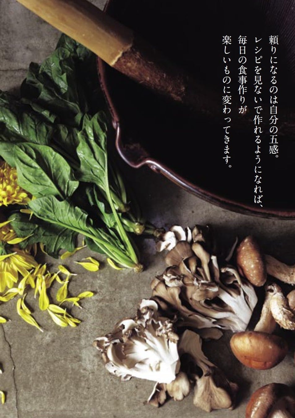 ナビに頼りすぎると自分の力で目的地に行けなくなるように、レシピに頼りきりでは料理が「自分のもの」になりません。本書では、料理作りの流れや勘どころをお伝えします。そして流れが頭に入ったら、レシピは脇に置き、自分の五感を使って作ることを提案します。
