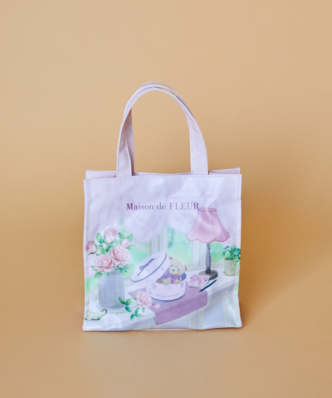 また、『FLEUR TEDDY』のイラストをプリントしたラミネート加工のバッグとポーチも展開。『FLEUR TEDDY』が、ギフトボックスから顔を出す様子や、お花を持った姿などを総柄でデザインし、『FLEUR TEDDY』の魅力を存分に楽しめるアイテムに仕上げました。