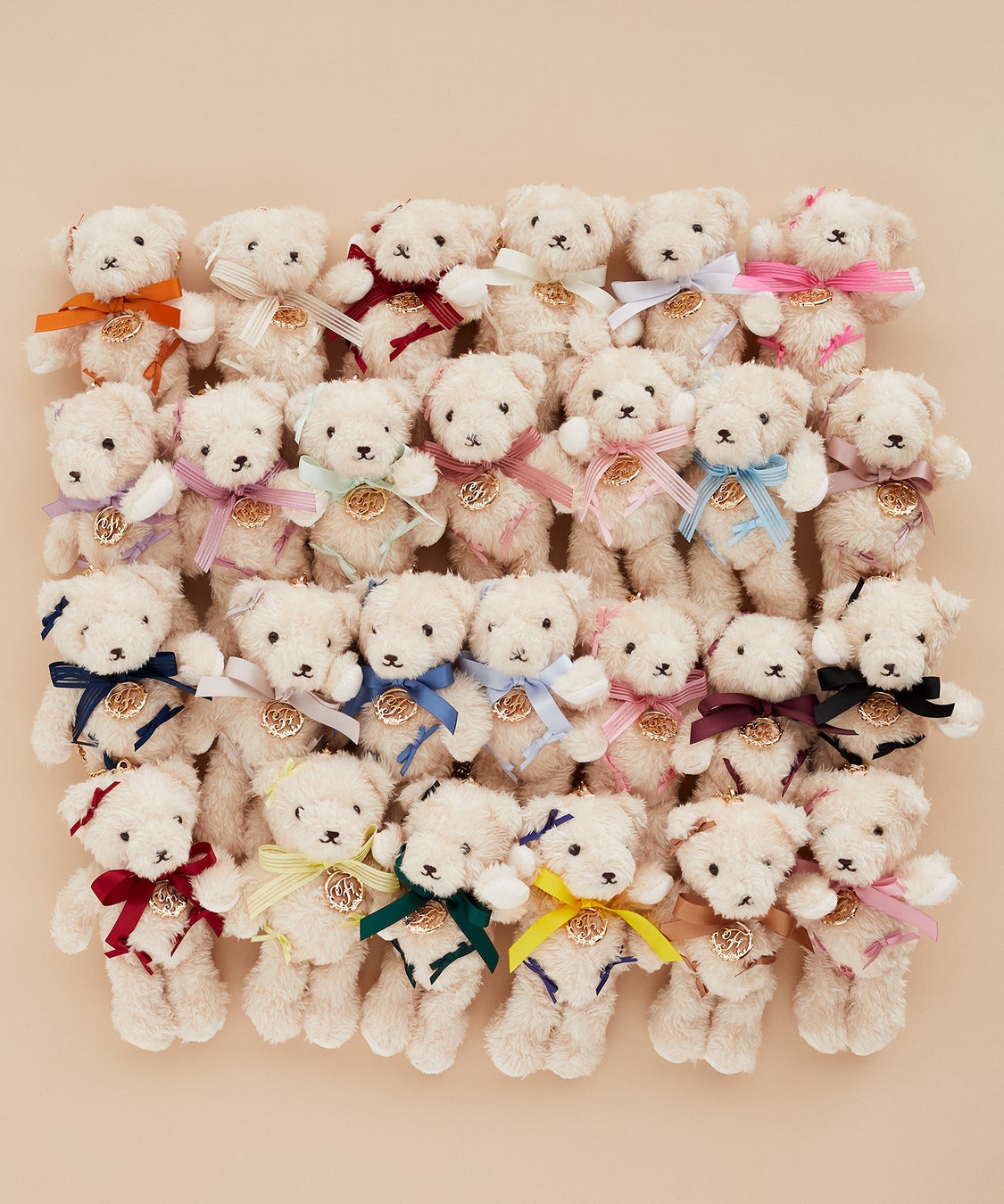 中でも注目アイテムは、Maison de FLEUR各店舗ごとに異なるカラーのリボンをまとった全26種類のぬいぐるみチャームです。胸元にリボンをあしらい、さらに3つの小さなリボンをアクセントにした愛らしいデザインとなっています。全国のMaison de FLEURを巡ってコレクションする楽しみも広がるアイテムです。