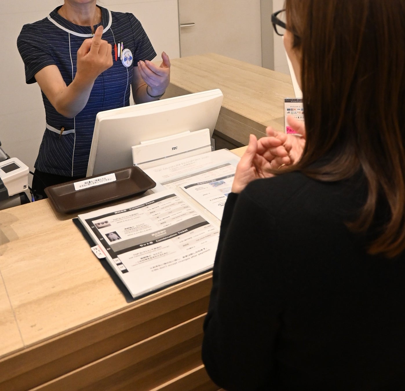 ファーストコンタクトにおいてもご安心いただけるよう、受付の体制を整えています。手話でのご案内や、手話通訳者が不在の時には遠隔手話サービスを提供している施設もあります。あわせて、コミュニケーションシート(日本語・英語)や文字表示アプリ、筆談器でもご案内しています。