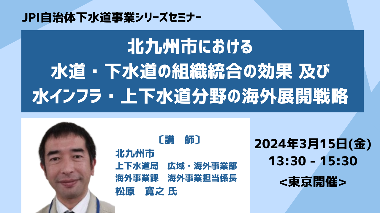 【JPIセミナー】「北九州市における水道・下水道の組織統合の効果 及び 水インフラ・上下水道分野の海外展開戦略」3月15日(金)<東京開催>